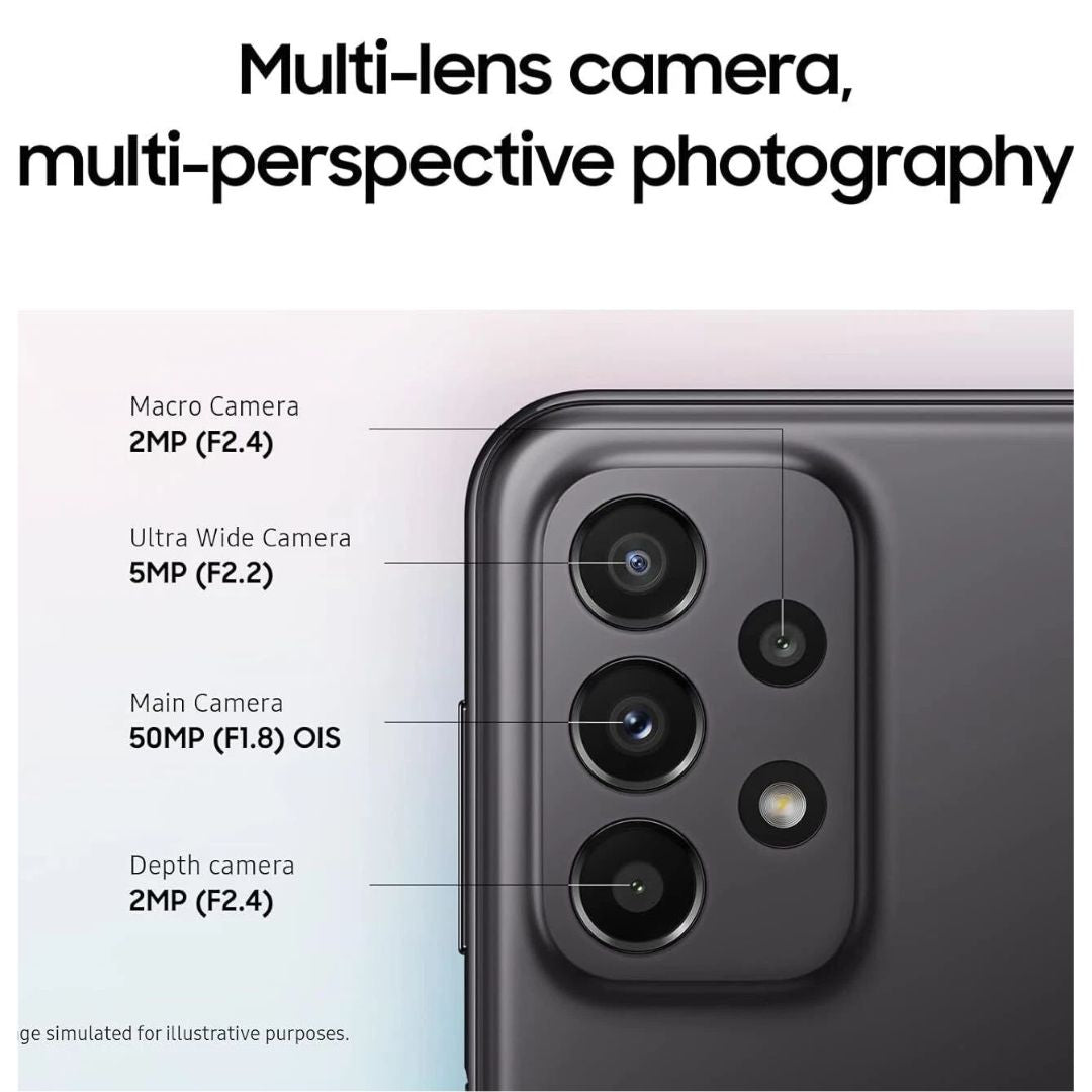 • 50 MP Quad‑Camera System: 50 MP main (ƒ/1.8, OIS), 5 MP ultrawide (ƒ/2.2), 2 MP macro (ƒ/2.4), 2 MP depth (ƒ/2.4) for versatile photography.